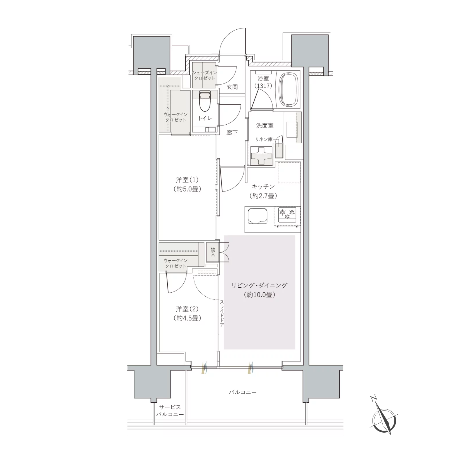リビングを柔軟に使いこなせるスライドドアを採用。2つのウォークインクロゼット+シューズインクロゼットで衣類も靴も美しく収まる、充実の収納設計。